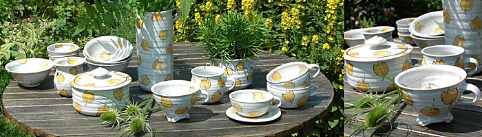Fröhliche Pracht. Der Blütenregen fällt auf weiße Glasur. Tassen mit und ohne Füßchen, Dosen, Vasen, Schalen u.s.w. leuchten durch den Tag.